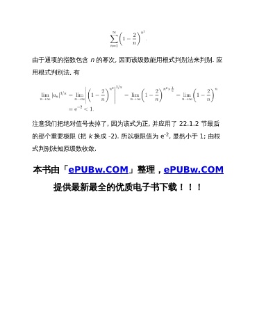 由于通项的指数包含 n 的幂次, 因而该级数能用根式判别法来判别. 应 用根式判别法, 有 注意我们把绝对值号去掉了, 因为该式为正, 并应用了 22.1.2 节最后 -2 的那个重要极限 (把 k 换成 -2). 所以极限值为 e , 显然小于 1; 由根 式判别法知原级数收敛. 本书由「ePUBw.COM」整理,ePUBw.COM 提供最新最全的优质电子书下载!!!