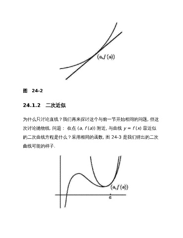 图 24-2 24.1.2 二次近似 为什么只讨论直线?我们再来探讨这个与前一节开始相同的问题, 但这 次讨论抛物线. 问题: 在点 (a, f (a)) 附近, 与曲线 y = f (x) 最近似 的二次曲线方程是什么?采用相同的函数, 图 24-3 是我们猜出的二次 曲线可能的样子.