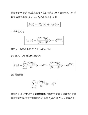 数都等于 0, 因为 P 是次数为 N 的多项式.) (3) N 阶余项R (x), 或 N N 称为 N 阶误差项, 是 f (x) - P (x). 对任意 N 有 N 余项表达式为 其中 c 一般求不出来, 它介于 x 与 a 之间. (4) 所以, f (x) 的完整表达式为 (5) 无穷级数 被称为 f (x) 关于 x = a 的泰勒级数. 对任何特定的 x, 该级数可能收 敛也可能发散. 若对任意特定的 x, 余项 R (x) 当 N → ∞ 时收敛于 N