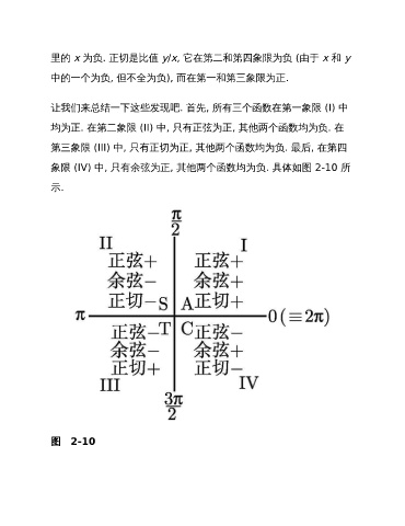 里的 x 为负. 正切是比值 y/x, 它在第二和第四象限为负 (由于 x 和 y 中的一个为负, 但不全为负), 而在第一和第三象限为正. 让我们来总结一下这些发现吧. 首先, 所有三个函数在第一象限 (I) 中 均为正. 在第二象限 (II) 中, 只有正弦为正, 其他两个函数均为负. 在 第三象限 (III) 中, 只有正切为正, 其他两个函数均为负. 最后, 在第四 象限 (IV) 中, 只有余弦为正, 其他两个函数均为负. 具体如图 2-10 所 示. 图 2-10