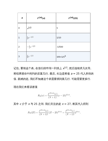 n f (n) (x) f (n) (25) 0 x 1/2 5 1 1/10 2 -1/500 3 3/8×1/5 5 记住, 要填这个表, 在首行的中间一列填上 x 1/2 , 然后连续求几次导, 将结果填在中间列的后面几行. 最后, 右边是将值 a = 25 代入所得的 值. 困难的是, 我们不知道这个表需要填到第几行. 可能需要更多行. 现在我们来看误差项 其中 c 介于 x 与 25 之间. 我们关注的是 x = 27, 将其代入得到