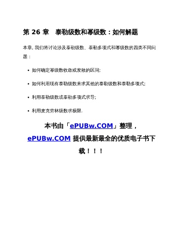 第 26 章 泰勒级数和幂级数:如何解题 本章, 我们将讨论涉及泰勒级数、泰勒多项式和幂级数的四类不同问 题: 如何确定幂级数收敛或发散的区间; 如何利用现有泰勒级数来求其他的泰勒级数和泰勒多项式; 利用泰勒级数或泰勒多项式求导; 利用麦克劳林级数求极限. 本书由「ePUBw.COM」整理, ePUBw.COM 提供最新最全的优质电子书下 载!!!