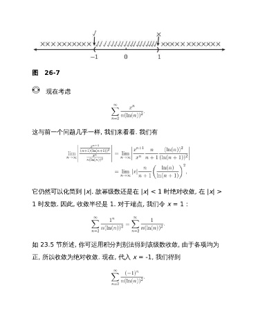 图 26-7 现在考虑 这与前一个问题几乎一样, 我们来看看. 我们有 它仍然可以化简到 |x|. 故幂级数还是在 |x| < 1 时绝对收敛, 在 |x| > 1 时发散. 因此, 收敛半径是 1. 对于端点, 我们令 x = 1: 如 23.5 节所述, 你可运用积分判别法得到该级数收敛, 由于各项均为 正, 所以收敛为绝对收敛. 现在, 代入 x = -1, 我们得到