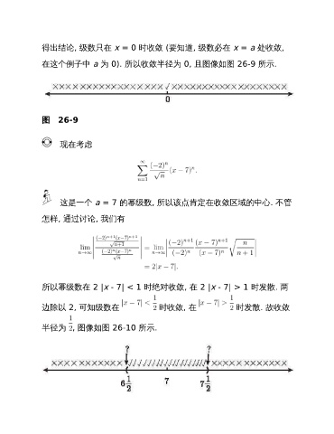 得出结论, 级数只在 x = 0 时收敛 (要知道, 级数必在 x = a 处收敛, 在这个例子中 a 为 0). 所以收敛半径为 0, 且图像如图 26-9 所示. 图 26-9 现在考虑 这是一个 a = 7 的幂级数, 所以该点肯定在收敛区域的中心. 不管 怎样, 通过讨论, 我们有 所以幂级数在 2 |x - 7| < 1 时绝对收敛, 在 2 |x - 7| > 1 时发散. 两 边除以 2, 可知级数在 时收敛, 在 时发散. 故收敛 半径为 , 图像如图 26-10 所示.