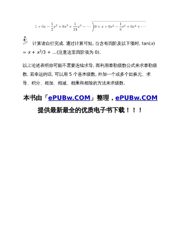 计算请自行完成. 通过计算可知, 当含有四阶及以下项时, tan(x) 3 = x + x /3 + …(注意这里四阶项为 0). 以上论述表明你可能不需要连续求导, 而利用泰勒级数公式来求泰勒级 数. 若幸运的话, 可以用 5 个基本级数, 外加一个或多个如换元、求 导、积分、相加、相减、相乘和相除的方法来求级数. 本书由「ePUBw.COM」整理,ePUBw.COM 提供最新最全的优质电子书下载!!!