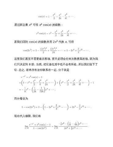 2 2 通过两边乘 x 可得 x cos(x) 的级数: 3 若我们回到 cos(x) 的级数并用 2x 代换 x, 可得 这里我们甚至不需要最后那项, 更不必理会任何次数更高的项, 因为我 们只决定到 8 阶. 当然, 把它放在其中也不会有坏处, 所以我们留下了 它. 总之, 若将所有这些联系在一起, 分子就是 而分母变为 现在代入极限, 我们有