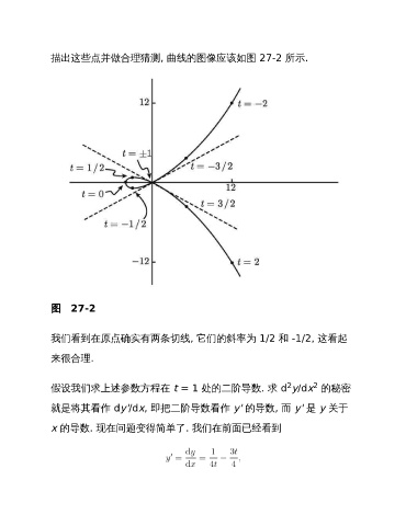 描出这些点并做合理猜测, 曲线的图像应该如图 27-2 所示. 图 27-2 我们看到在原点确实有两条切线, 它们的斜率为 1/2 和 -1/2, 这看起 来很合理. 2 2 假设我们求上述参数方程在 t = 1 处的二阶导数. 求 d y/dx 的秘密 就是将其看作 dy'/dx, 即把二阶导数看作 y' 的导数, 而 y' 是 y 关于 x 的导数. 现在问题变得简单了. 我们在前面已经看到