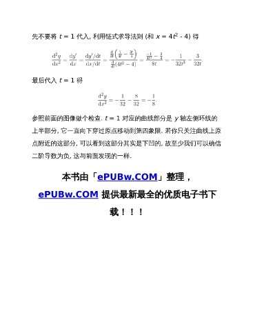 2 先不要将 t = 1 代入, 利用链式求导法则 (和 x = 4t - 4) 得 最后代入 t = 1 得 参照前面的图像做个检查. t = 1 对应的曲线部分是 y 轴左侧环线的 上半部分, 它一直向下穿过原点移动到第四象限. 若你只关注曲线上原 点附近的这部分, 可以看到这部分其实是下凹的, 故至少我们可以确信 二阶导数为负, 这与前面发现的一样. 本书由「ePUBw.COM」整理, ePUBw.COM 提供最新最全的优质电子书下 载!!!