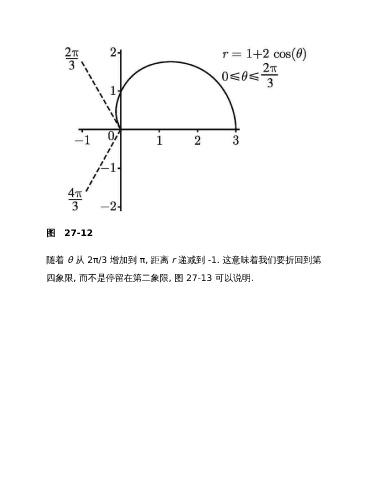 图 27-12 随着 θ 从 2π/3 增加到 π, 距离 r 递减到 -1. 这意味着我们要折回到第 四象限, 而不是停留在第二象限, 图 27-13 可以说明.