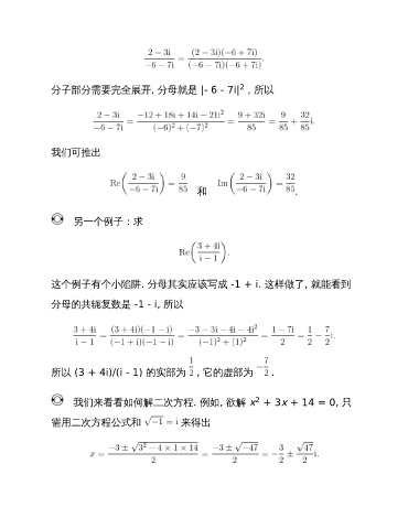 2 分子部分需要完全展开, 分母就是 |- 6 - 7i| , 所以 我们可推出 和 . 另一个例子:求 这个例子有个小陷阱. 分母其实应该写成 -1 + i. 这样做了, 就能看到 分母的共轭复数是 -1 - i, 所以 所以 (3 + 4i)/(i - 1) 的实部为 , 它的虚部为 . 2 我们来看看如何解二次方程. 例如, 欲解 x + 3x + 14 = 0, 只 需用二次方程公式和 来得出