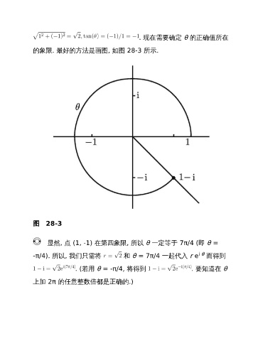 . 现在需要确定 θ 的正确值所在 的象限. 最好的方法是画图, 如图 28-3 所示. 图 28-3 显然, 点 (1, -1) 在第四象限, 所以 θ 一定等于 7π/4 (即 θ = i θ -π/4). 所以, 我们只需将 和 θ = 7π/4 一起代入 r e 而得到 . (若用 θ = -π/4, 将得到 . 要知道在 θ 上加 2π 的任意整数倍都是正确的.)