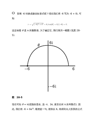 那将 -6 转换成极坐标形式呢?现在我们将 -6 写为 -6 + 0i, 可 知 这意味着 θ 是 π 的整数倍, 为了确定它, 我们画另一幅图 (见图 28- 5). 图 28-5 现在可知 θ = π(或随你喜欢, 选 -π、3π, 甚至任何 π 的奇数倍). 因 iπ 此, 我们有 -6 = 6e . 顺便提一句, 若除以 6, 将得到令人惊异的公式