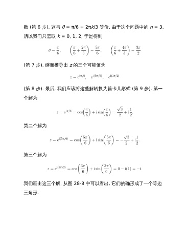 数 (第 6 步). 这与 θ = π/6 + 2πk/3 等价, 由于这个问题中的 n = 3, 所以我们只需取 k = 0, 1, 2, 于是得到 (第 7 步). 继而推导出 z 的三个可能值为 (第 8 步). 最后, 我们应该将这些解转换为笛卡儿形式 (第 9 步). 第一 个解为 第二个解为 第三个解为 我们画出这三个解, 从图 28-8 中可以看出, 它们的确形成了一个等边 三角形.