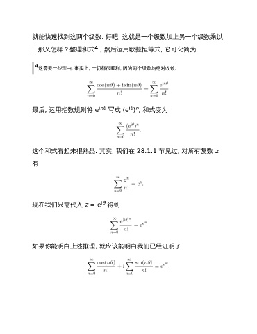 就能快速找到这两个级数. 好吧, 这就是一个级数加上另一个级数乘以 4 i. 那又怎样?整理和式 , 然后运用欧拉恒等式, 它可化简为 4 这需要一些理由. 事实上, 一切都很顺利, 因为两个级数均绝对收敛. iθ n 最后, 运用指数规则将 e inθ 写成 (e ) , 和式变为 这个和式看起来很熟悉. 其实, 我们在 28.1.1 节见过, 对所有复数 z 有 iθ 现在我们只需代入 z = e 得到 如果你能明白上述推理, 就应该能明白我们已经证明了