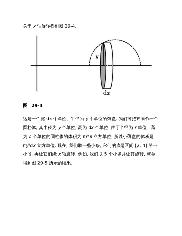 关于 x 轴旋转得到图 29-4. 图 29-4 这是一个宽 dx 个单位、半径为 y 个单位的薄盘. 我们可把它看作一个 圆柱体, 其半径为 y 个单位, 高为 dx 个单位. 由于半径为 r 单位、高 2 为 h 个单位的圆柱体的体积为 πr h 立方单位, 所以小薄盘的体积是 2 πy dx 立方单位. 现在, 我们取一些小条, 它们的底是区间 [2, 4] 的一 小段, 再让它们绕 x 轴旋转. 例如, 我们取 5 个小条并让其旋转, 就会 得到图 29-5 所示的结果.