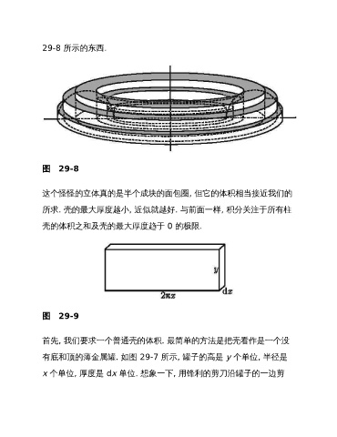 29-8 所示的东西. 图 29-8 这个怪怪的立体真的是半个成块的面包圈, 但它的体积相当接近我们的 所求. 壳的最大厚度越小, 近似就越好. 与前面一样, 积分关注于所有柱 壳的体积之和及壳的最大厚度趋于 0 的极限. 图 29-9 首先, 我们要求一个普通壳的体积. 最简单的方法是把壳看作是一个没 有底和顶的薄金属罐. 如图 29-7 所示, 罐子的高是 y 个单位, 半径是 x 个单位, 厚度是 dx 单位. 想象一下, 用锋利的剪刀沿罐子的一边剪