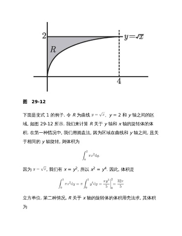 图 29-12 下面是变式 1 的例子. 令 R 为曲线 、y = 2 和 y 轴之间的区 域, 如图 29-12 所示. 我们来计算 R 关于 y 轴和 x 轴的旋转体的体 积. 在第一种情况中, 我们用圆盘法, 因为区域在曲线和 y 轴之间, 且关 于相同的 y 轴旋转, 则体积为 2 2 4 因为 , 我们有 x = y , 所以 x = y . 因此, 体积是 立方单位. 第二种情况, R 关于 x 轴的旋转体的体积用壳法求, 其体积 为