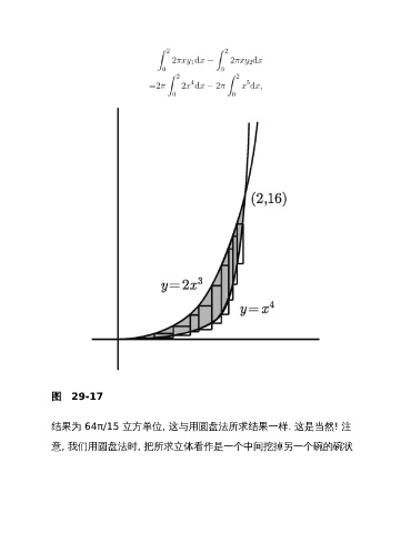 图 29-17 结果为 64π/15 立方单位, 这与用圆盘法所求结果一样. 这是当然! 注 意, 我们用圆盘法时, 把所求立体看作是一个中间挖掉另一个碗的碗状
