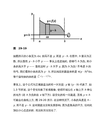 符号, 我们看到小条的高为 y - h, 所以相应的圆盘体积是 π(y - h) dx,