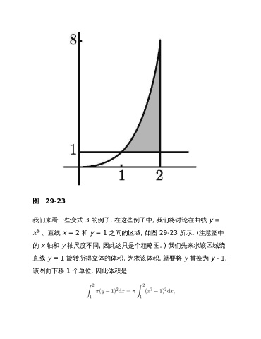 图 29-23 我们来看一些变式 3 的例子. 在这些例子中, 我们将讨论在曲线 y = 3 x 、直线 x = 2 和 y = 1 之间的区域, 如图 29-23 所示. (注意图中 的 x 轴和 y 轴尺度不同, 因此这只是个粗略图. ) 我们先来求该区域绕 直线 y = 1 旋转所得立体的体积. 为求该体积, 就要将 y 替换为 y - 1, 该图向下移 1 个单位. 因此体积是