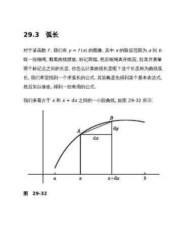29.3 弧长 对于某函数 f , 我们有 y = f (x) 的图像, 其中 x 的取值范围为 a 到 b. 取一段细绳, 顺着曲线摆放, 标记两端, 然后细绳离开纸面, 拉直并测量 两个标记点之间的长度. 你怎么计算曲线长度呢?这个长度称为曲线弧 长, 我们希望找到一个求弧长的公式. 其策略是先得到某个基本表达式, 然后加以修改, 得到一些有用的公式. 我们来看介于 x 和 x + dx 之间的一小段曲线, 如图 29-32 所示. 图 29-32