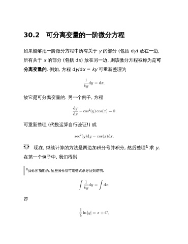 30.2 可分离变量的一阶微分方程 如果能够把一阶微分方程中所有关于 y 的部分 (包括 dy) 放在一边, 所有关于 x 的部分 (包括 dx) 放在另一边, 则该微分方程被称为是可 分离变量的. 例如, 方程 dy/dx = ky 可重新整理为 故它是可分离变量的. 另一个例子, 方程 可重新整理 (代数运算自行验证!) 成 1 现在, 继续计算的方法是两边加积分号并积分, 然后整理 求 y. 在第一个例子中, 我们得到 1 如你所预期的, 这些操作都可用链式求导法则证明. 即
