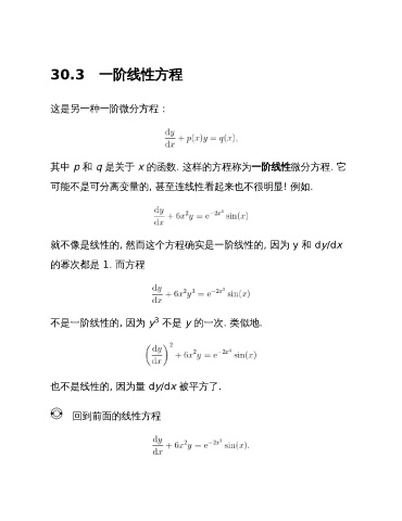 30.3 一阶线性方程 这是另一种一阶微分方程: 其中 p 和 q 是关于 x 的函数. 这样的方程称为一阶线性微分方程. 它 可能不是可分离变量的, 甚至连线性看起来也不很明显! 例如. 就不像是线性的, 然而这个方程确实是一阶线性的, 因为 y 和 dy/dx 的幂次都是 1. 而方程 3 不是一阶线性的, 因为 y 不是 y 的一次. 类似地. 也不是线性的, 因为量 dy/dx 被平方了. 回到前面的线性方程