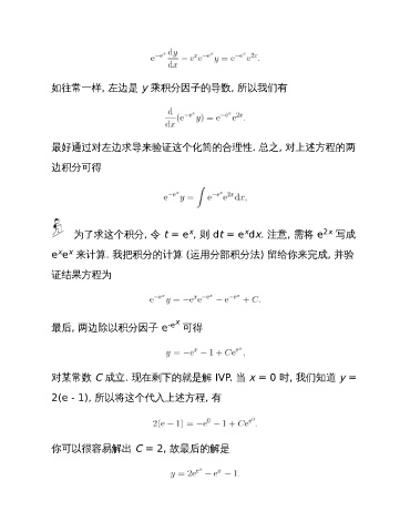 最后, 两边除以积分因子 e -e x 可得