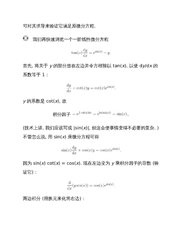 可对其求导来验证它满足原微分方程. 我们再快速浏览一个一阶线性微分方程 首先, 将关于 y 的部分放在左边并令方程除以 tan(x), 以使 dy/dx 的 系数等于 1: y 的系数是 cot(x), 故 积分因子 . (技术上讲, 我们应该写成 |sin(x)|, 但这会使事情变得不必要的复杂. ) 不管怎么说, 用 sin(x) 乘微分方程可得 因为 sin(x) cot(x) = cos(x). 现在左边变为 y 乘积分因子的导数 (验 证它): 两边积分 (用换元来化简右边):
