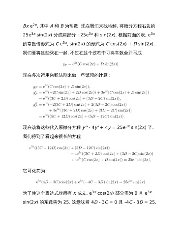 现在该将这些代入原微分方程 y'' - 4y' + 4y = 25e sin(2x) 了.