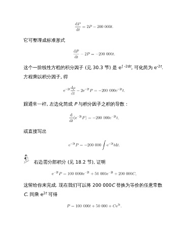 它可整理成标准形式 这个一阶线性方程的积分因子 (见 30.3 节) 是 e ∫ -2dt , 可化简为 e -2t . 方程乘以积分因子, 得 跟通常一样, 左边化简成 P 与积分因子之积的导数: 或直接写出 右边需分部积分 (见 18.2 节), 证明 这留给你来完成. 现在我们可以将 200 000C 替换为等价的任意常数 2t C. 同乘 e 可得