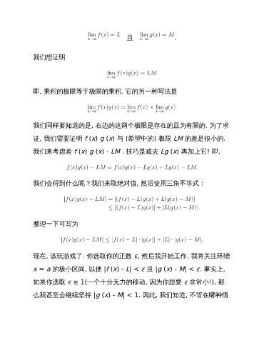 证, 我们需要证明 f (x) g (x) 与 (希望中的) 极限 LM 的差是很小的.