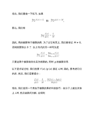 现在, 我们重做一下练习. 如果 和 , 那么, 我们有 因此, 商的极限等于极限的商. 为了让它有意义, 我们要保证 M ≠ 0, 否则就要除以 0 了. 以上等式的另一种写法是 只要这两个极限都存在且为有限的, 同时 g 的极限非零. 以下是求证过程. 我们想要 f (x) /g (x) 接近 L/M, 因此, 要考虑它们 的差. 然后, 我们需要通分: 现在, 我们使用一个类似于极限的乘积中的技巧:在分子上减去并加 上 LM, 然后做因式分解, 会得到