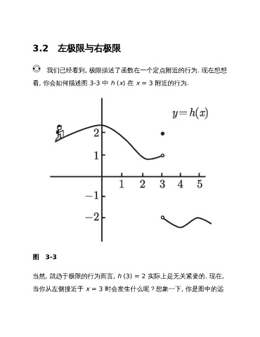 3.2 左极限与右极限 我们已经看到, 极限描述了函数在一个定点附近的行为. 现在想想 看, 你会如何描述图 3-3 中 h (x) 在 x = 3 附近的行为. 图 3-3 当然, 就趋于极限的行为而言, h (3) = 2 实际上是无关紧要的. 现在, 当你从左侧接近于 x = 3 时会发生什么呢?想象一下, 你是图中的远