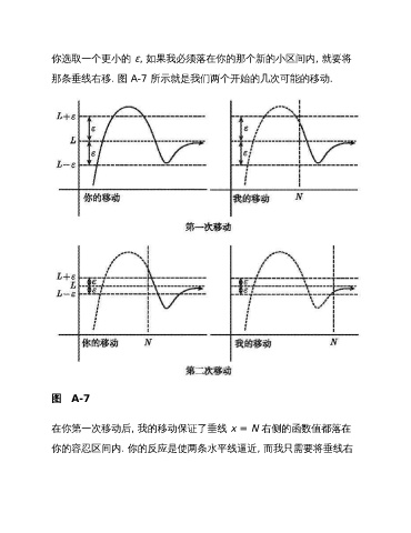 你选取一个更小的 ε, 如果我必须落在你的那个新的小区间内, 就要将 那条垂线右移. 图 A-7 所示就是我们两个开始的几次可能的移动. 图 A-7 在你第一次移动后, 我的移动保证了垂线 x = N 右侧的函数值都落在 你的容忍区间内. 你的反应是使两条水平线逼近, 而我只需要将垂线右