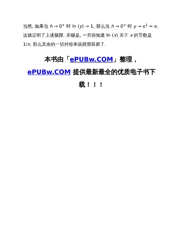 1 + + 当然, 如果当 h → 0 时 ln (y) → 1, 那么当 h → 0 时 y → e = e. 这就证明了上述极限. 关键是, 一旦你知道 ln (x) 关于 x 的导数是 1/x, 那么其余的一切对你来说就很容易了. 本书由「ePUBw.COM」整理, ePUBw.COM 提供最新最全的优质电子书下 载!!!