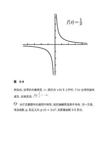 图 3-4 类似地, 这里的左极限是 -∞, 因为当 x 向 0 上升时, f (x) 会变得越来 越负. 这就是说, 由于左极限和右极限不相等, 故双侧极限显然不存在. 另一方面, 2 考虑函数 g, 其定义为 g (x) = 1/x , 其图像如图 3-5 所示.