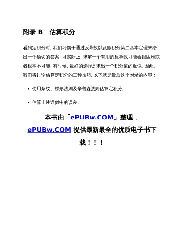 附录 B 估算积分 看到定积分时, 我们习惯于通过反导数以及微积分第二基本定理来给 出一个确切的答案. 可实际上, 求解一个有用的反导数可能会很困难或 者根本不可能. 有时候, 最好的选择是求出一个积分值的近似. 因此, 我们将讨论估算定积分的三种技巧, 以下就是最后这个附录的内容: 使用条纹、梯形法则及辛普森法则估算定积分; 估算上述近似中的误差. 本书由「ePUBw.COM」整理, ePUBw.COM 提供最新最全的优质电子书下 载!!!