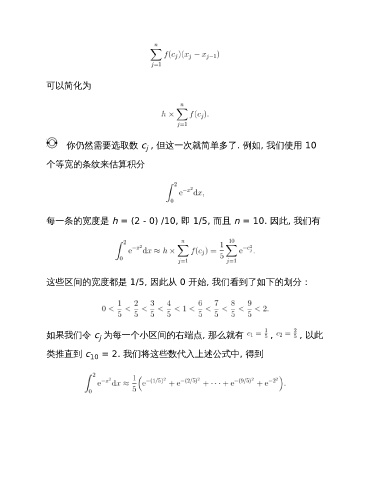 可以简化为 你仍然需要选取数 c , 但这一次就简单多了. 例如, 我们使用 10 j 个等宽的条纹来估算积分 每一条的宽度是 h = (2 - 0) /10, 即 1/5, 而且 n = 10. 因此, 我们有 这些区间的宽度都是 1/5, 因此从 0 开始, 我们看到了如下的划分: 如果我们令 c 为每一个小区间的右端点, 那么就有 , , 以此 j 类推直到 c = 2. 我们将这些数代入上述公式中, 得到 10