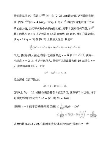 我们需要求 M , 它是 |f (4) (x)| 在 [0, 2] 上的最大值. 这可能非常繁