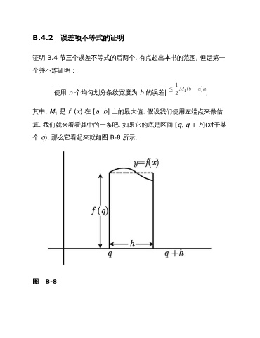 B.4.2 误差项不等式的证明 证明 B.4 节三个误差不等式的后两个, 有点超出本书的范围, 但是第一 个并不难证明: |使用 n 个均匀划分条纹宽度为 h 的误差| , 其中, M 是 f' (x) 在 [a, b] 上的最大值. 假设我们使用左端点来做估 1 算. 我们就来看看其中的一条吧. 如果它的底是区间 [q, q + h](对于某 个 q), 那么它看起来就如图 B-8 所示. 图 B-8