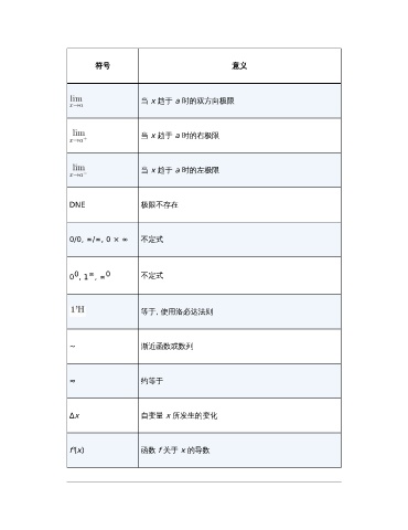 符号 意义 当 x 趋于 a 时的双方向极限 当 x 趋于 a 时的右极限 当 x 趋于 a 时的左极限 DNE 极限不存在 0/0, ∞/∞, 0 × ∞ 不定式 ∞ 0 0 , 1 , ∞ 0 不定式 等于, 使用洛必达法则 ~ 渐近函数或数列 ≈ 约等于 Δx 自变量 x 所发生的变化 f'(x) 函数 f 关于 x 的导数