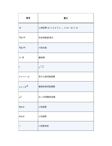 符号 意义 n! n 的阶乘 (1 × 2 × 3 × … × (n - 1) × n) P (x) N 阶泰勒多项式 N R (x) n 阶余项 N (r, θ) 极坐标 i z = x + iy 笛卡儿形式的复数 z = r e iθ 极坐标形式的复数 e z 以 z 为指数的复数 Re(z) z 的实部 Im(z) z 的虚部 z 的复共轭