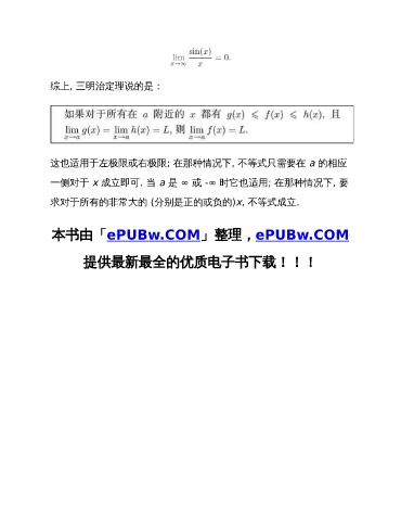 综上, 三明治定理说的是: 这也适用于左极限或右极限; 在那种情况下, 不等式只需要在 a 的相应 一侧对于 x 成立即可. 当 a 是 ∞ 或 -∞ 时它也适用; 在那种情况下, 要 求对于所有的非常大的 (分别是正的或负的)x, 不等式成立. 本书由「ePUBw.COM」整理,ePUBw.COM 提供最新最全的优质电子书下载!!!