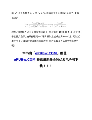 2 将 x - 25 分解为 (x - 5) (x + 5) 并消去分子分母中的公因子, 此极 限变为 现在, 如果代入 x = 5 就没有问题了, 你会得到 10/8, 即 5/4. 这个例 子的要义在于, 如果你碰到一个平方根加上或减去另外一个量, 可以试 着把分子分母同时乘以其共轭表达式, 也许会有令人高兴的惊喜发生 呢! 本书由「ePUBw.COM」整理, ePUBw.COM 提供最新最全的优质电子书下 载!!!