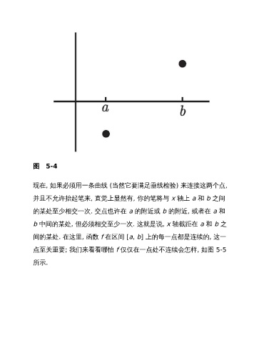 图 5-4 现在, 如果必须用一条曲线 (当然它要满足垂线检验) 来连接这两个点, 并且不允许抬起笔来, 直觉上显然有, 你的笔将与 x 轴上 a 和 b 之间 的某处至少相交一次. 交点也许在 a 的附近或 b 的附近, 或者在 a 和 b 中间的某处, 但必须相交至少一次. 这就是说, x 轴截距在 a 和 b 之 间的某处. 在这里, 函数 f 在区间 [a, b] 上的每一点都是连续的, 这一 点至关重要; 我们来看看哪怕 f 仅仅在一点处不连续会怎样, 如图 5-5 所示.