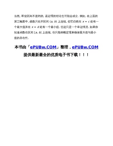 当然, 即使区间不是闭的, 该定理的结论也可能会成立. 例如, 在上面的 第三幅图中, 函数只在开区间 (a, b) 上连续, 但它仍然在 x = c 处有一 个最大值并在 x = d 处有一个最小值. 但这只是一个幸运情况. 如果你 知道函数在区间 [a, b] 上连续, 你只能仰赖定理来确保最大值与最小 值的存在性. 本书由「ePUBw.COM」整理,ePUBw.COM 提供最新最全的优质电子书下载!!!