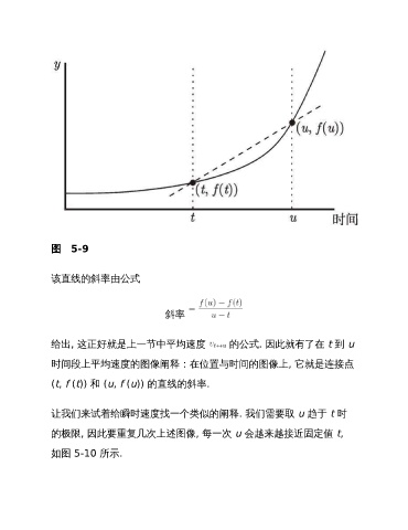 图 5-9 该直线的斜率由公式 斜率 给出, 这正好就是上一节中平均速度 的公式. 因此就有了在 t 到 u 时间段上平均速度的图像阐释:在位置与时间的图像上, 它就是连接点 (t, f (t)) 和 (u, f (u)) 的直线的斜率. 让我们来试着给瞬时速度找一个类似的阐释. 我们需要取 u 趋于 t 时 的极限, 因此要重复几次上述图像, 每一次 u 会越来越接近固定值 t, 如图 5-10 所示.