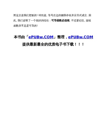 而这正是我们想要的! 特别是, 等号左边的极限存在并且等式成立. 因 此, 我们证明了一个很好的结论:可导函数必连续. 不过要记住, 连续 函数并不总是可导的! 本书由「ePUBw.COM」整理,ePUBw.COM 提供最新最全的优质电子书下载!!!