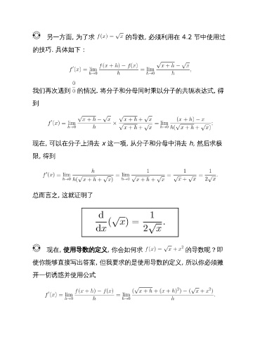 另一方面, 为了求 的导数, 必须利用在 4.2 节中使用过 的技巧. 具体如下: 我们再次遇到 的情况. 将分子和分母同时乘以分子的共轭表达式, 得 到 现在, 可以在分子上消去 x 这一项, 从分子和分母中消去 h, 然后求极 限, 得到 总而言之, 这就证明了 现在, 使用导数的定义, 你会如何求 的导数呢?即 使你能够直接写出答案, 但我要求的是使用导数的定义, 所以你必须撇 开一切诱惑并使用公式